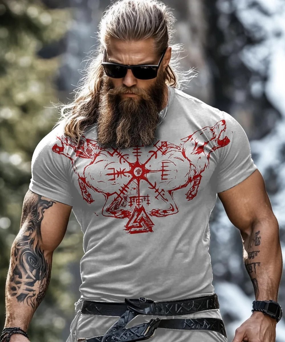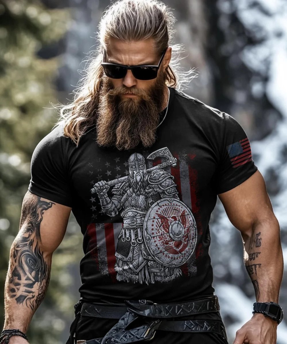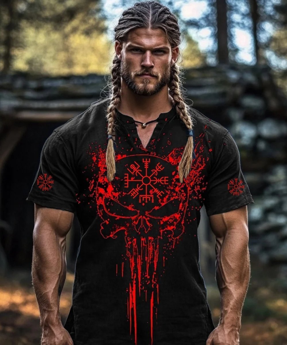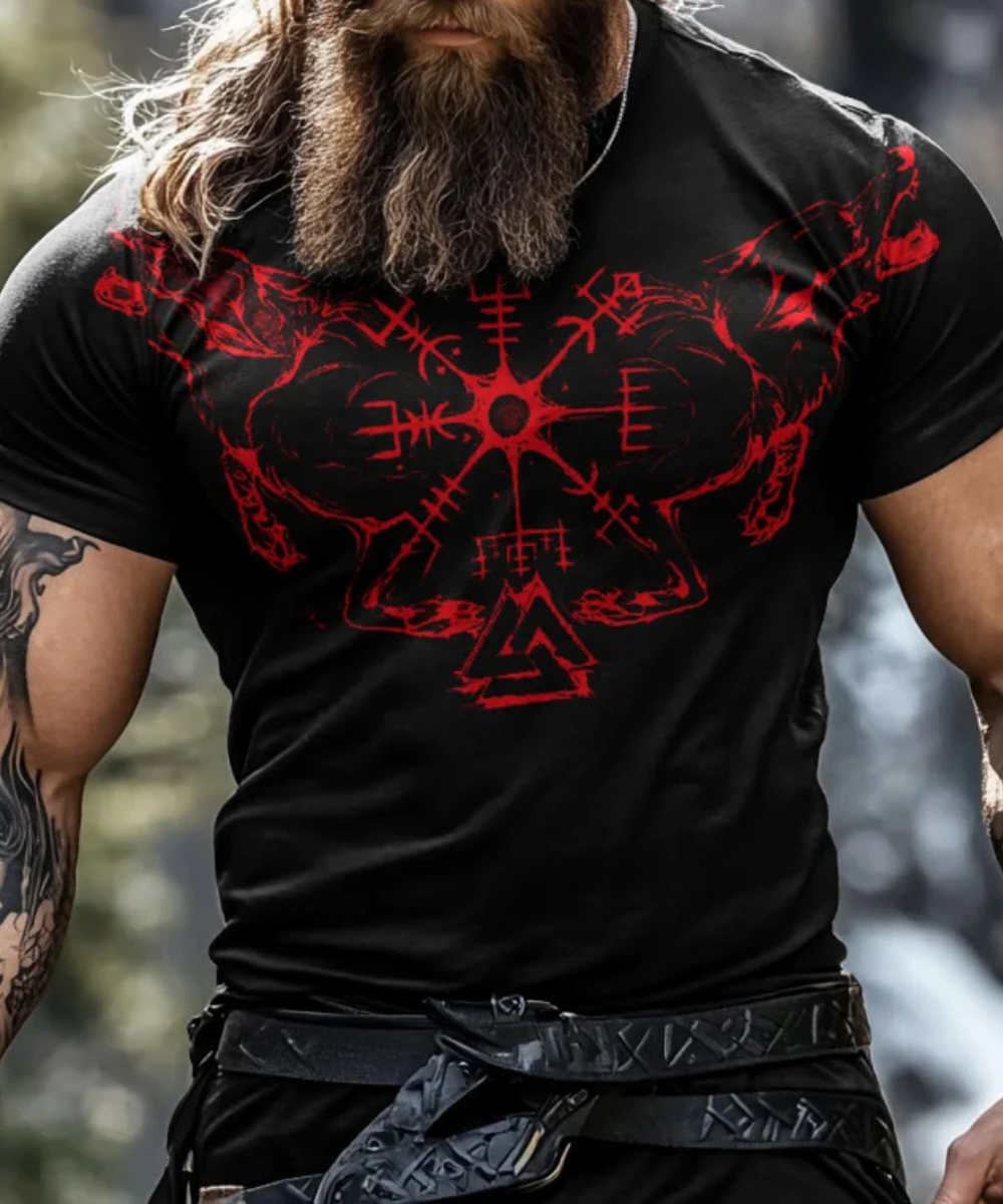 Heavy gym sessions ho ya street presence, ye tee body-hugging athletic fit ke saath confidence amplify karti hai. Dark Nordic energy, sharp detailing aur brutal aesthetics isse crowd se alag banate hain — bina overdo kiye.